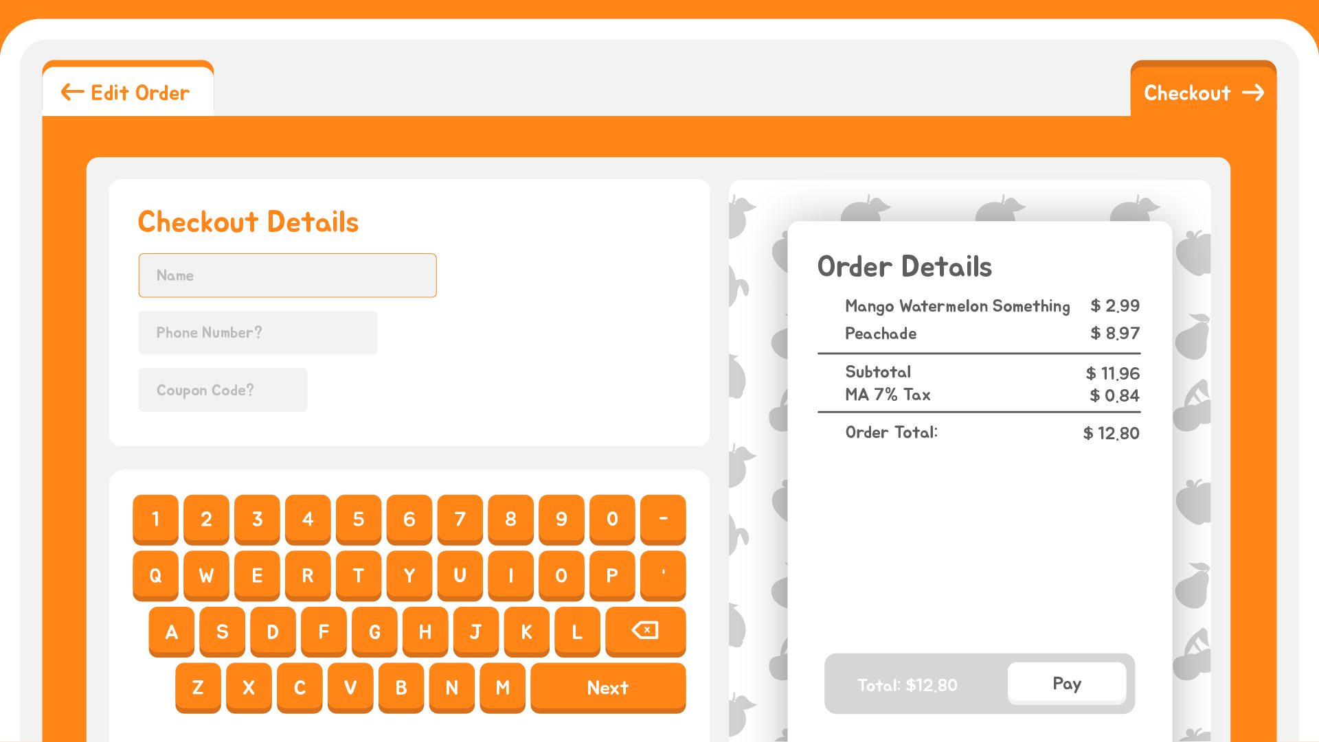 Once an order has been paid for, there is a clear indication that the transaction is complete, with instructions for how the user should proceed. Additionally, the name of the user is displayed to encourage them to pay attention to the instructions for how they should proceed. Without this, a user might just press close and ask a worker where their order is. The window would close automatically, so the next person in line has an easier time beginning their order.